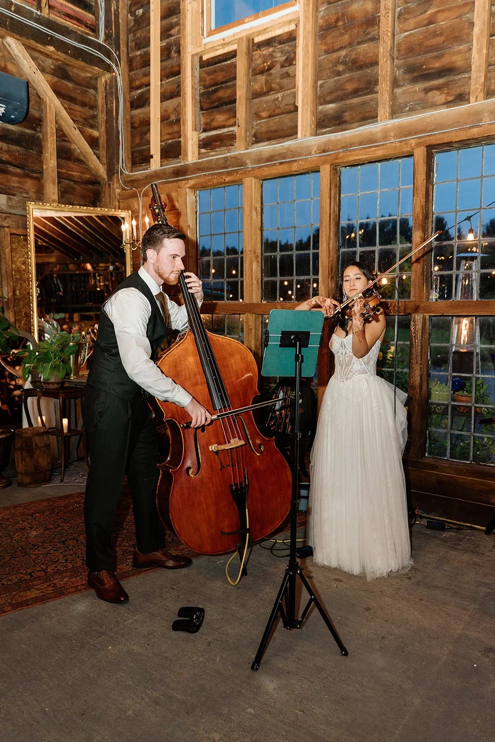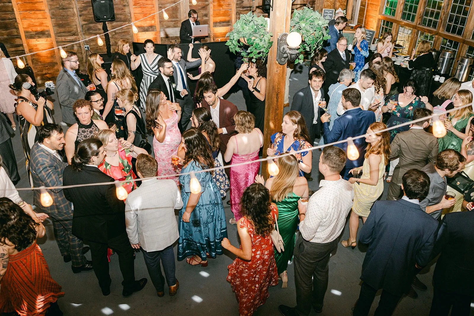 The barn is so cool — decorated beautifully, it’s rustic charm is warm and inviting. The gigantic disco ball above glimmers, my professional sound system and powerful subwoofers send the room vibrating (tastefully, it’s never uncomfortably loud!), and the upper level is so chic; leather couches, Tiffany lamps, vinyl records, cool artwork and antique books, a photo booth inside a classic phone booth… it’s just so fun and perfect!